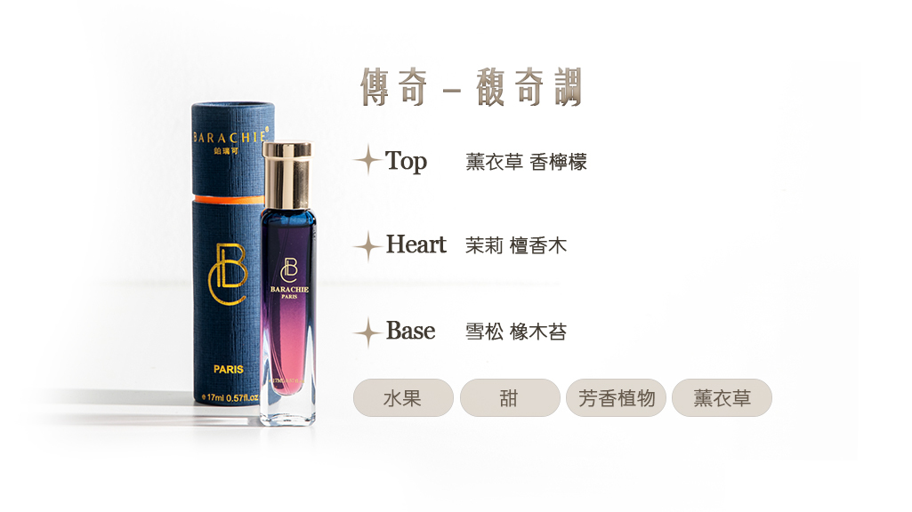 《傳奇》像一段被時間反覆傳誦的故事,低聲卻深刻。氣味初起,薰衣草與香檸檬帶來乾淨而溫和的開場,微甜中透著芳香植物的清新,像清晨陽光灑落時的從容步伐。隨著時間流動,茉莉的柔軟花香與檀香木交織,溫潤而內斂,彷彿歷經世事後仍保有溫度的心。最後,雪松與橡木苔沉穩落下,帶來安定而悠長的餘韻。《傳奇》不是張揚的存在,而是一種靜靜陪伴的力量,在不經意間,成為被記住的名字。