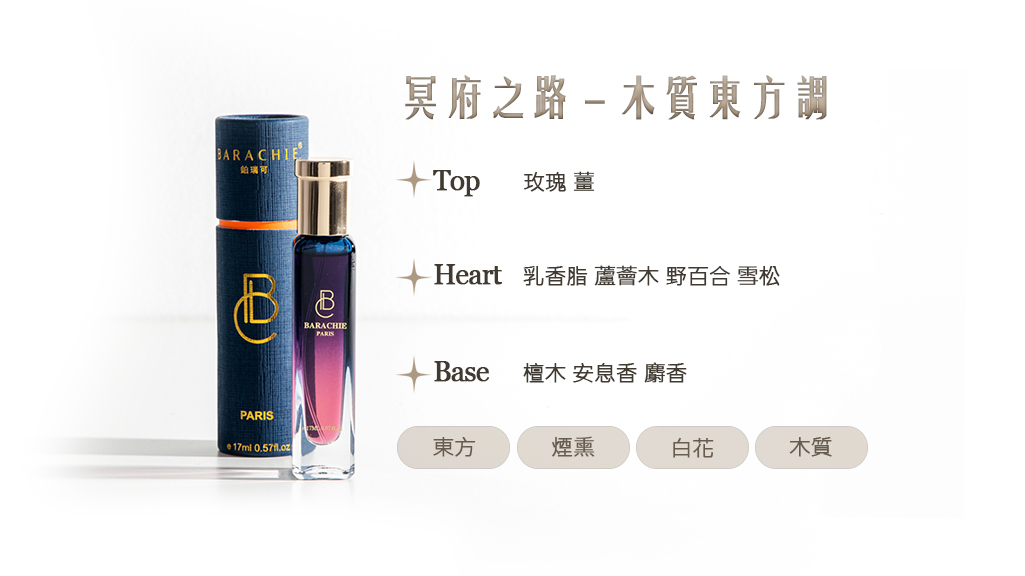《冥府之路》像一條通往內心深處的靜謐小徑,幽暗卻不令人恐懼。香氣初現,焚香的煙霧緩緩升起,空氣中瀰漫著神聖而古老的氣息,彷彿跨過一扇無聲的門。隨後,雪松的木質輪廓逐漸成形,冷靜而堅定,為整體撐起沉穩的結構。百合在其中悄然綻放,潔白而內斂,為深色的氣息注入一絲溫柔的光。《冥府之路》不是關於終結,而是關於回歸——在煙燻與木質之間,靜靜走向真正的自己。