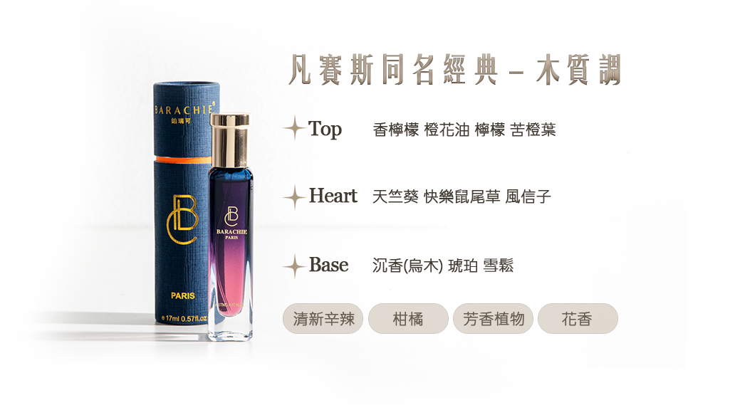 《凡賽斯同名經典》像一位走進房間便自然吸引目光的人,不需多言,自有分量。香氣開場,香檸檬與檸檬的清亮柑橘氣息交織橙花油與苦橙葉,清新而俐落,帶著剛洗淨晨光的乾淨感受。隨後,天竺葵與快樂鼠尾草慢慢展開,風信子的花香在其中流動,柔和卻不失精神,彷彿自信在舉手投足間自然流露。最後,沉香、琥珀與雪鬆沉穩落下,木質氣息貼近肌膚,溫暖而深邃。《凡賽斯同名經典》是一種歷久彌新的氣質,在清新與力量之間,留下屬於經典的餘韻。