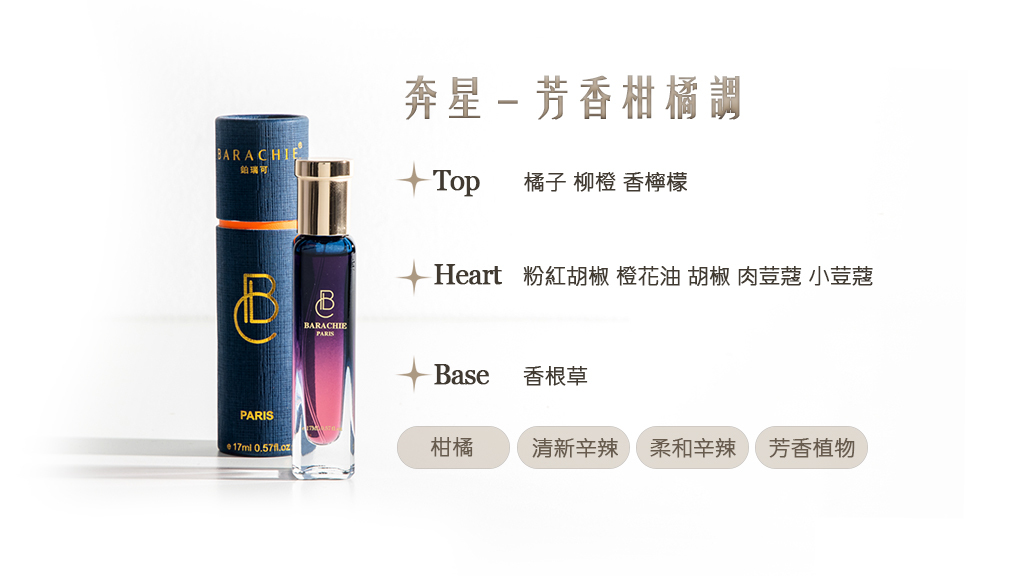 《奔星》像劃過夜空的一道光,短暫卻讓人無法忽視。氣味一開始,橘子、柳橙與檸檬同時綻放,明亮又純粹,彷彿清晨第一口空氣,讓人不自覺抬頭微笑。接著,粉紅胡椒與多種辛香慢慢浮現,橙花油的柔和在其中平衡,像心跳加速的瞬間,帶著期待與勇氣向前奔去。最後,只留下香根草安靜而踏實的氣息,將一切穩穩收住。《奔星》不是停留的香味,而是一段正在前行的狀態,清新、溫熱,提醒你別忘了追逐屬於自己的光。