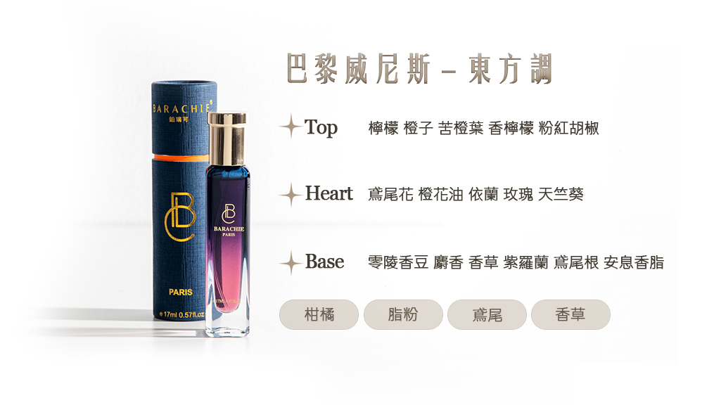 《巴黎-威尼斯》像一場浪漫而又優雅的旅程,光影在水道間閃爍,氣息隨風流動。前調的檸檬與橙子明亮而清新,苦橙葉與香檸檬交織,粉紅胡椒微微挑動感官,彷彿踏上舊城石板路的第一步,帶著期待與好奇。中調的鳶尾花、橙花油、依蘭、玫瑰與天竺葵緩緩綻放,花香與脂粉感交錯,如午后陽光透過窗棂灑在古典宮殿的地板上,柔和而浪漫。最後,零陵香豆、香草、麝香、紫羅蘭與安息香脂沉穩收尾,餘韻溫暖而細膩,像輕輕擁抱著旅行的回憶。《巴黎-威尼斯》是一段香氣的旅程,在清新與溫潤、花香與脂粉間,讓心隨之流動。