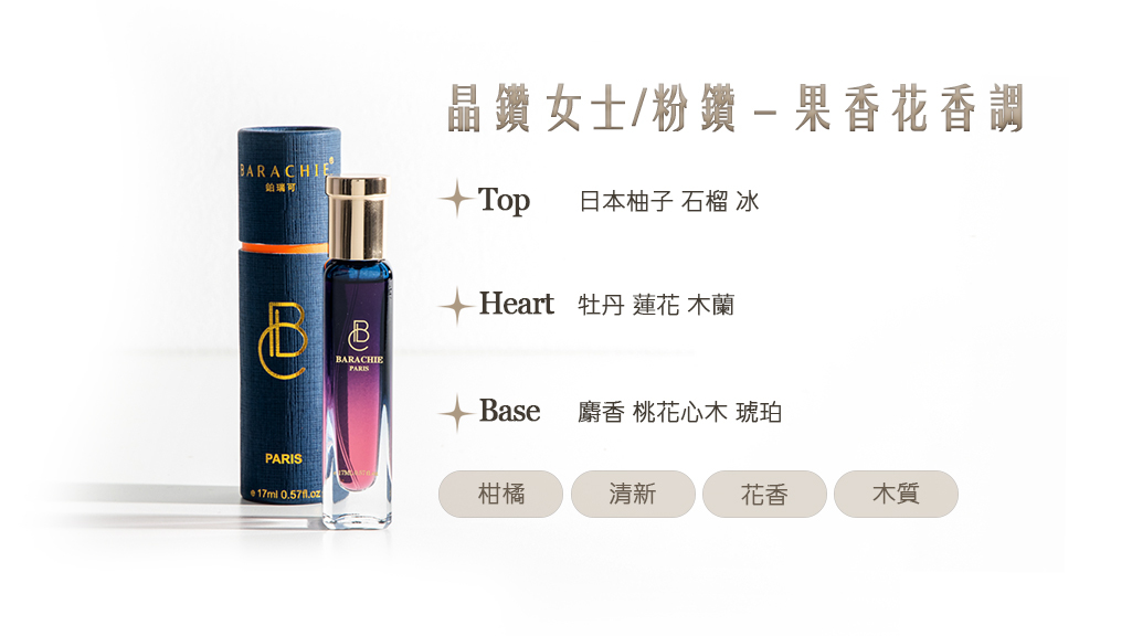 《晶鑽女士/粉鑽》像晨光下閃爍的露珠,清新、璀璨又充滿活力。前調的日本柚子與石榴帶來明亮果香,冰感的點綴如微風輕拂臉龐,清爽而提神,像第一口清晨的空氣。中調的牡丹、蓮花與木蘭緩緩綻放,花香柔美而優雅,如光線穿過花瓣,輕柔地包裹心緒。最後,麝香、桃花心木與琥珀沉穩收尾,木質與香氣交融,留下溫暖而持久的餘韻。《晶鑽女士/粉鑽》是一款清新果香與優雅花香兼具的香氛,如晨光下的閃耀瞬間,悄悄點亮每一天。