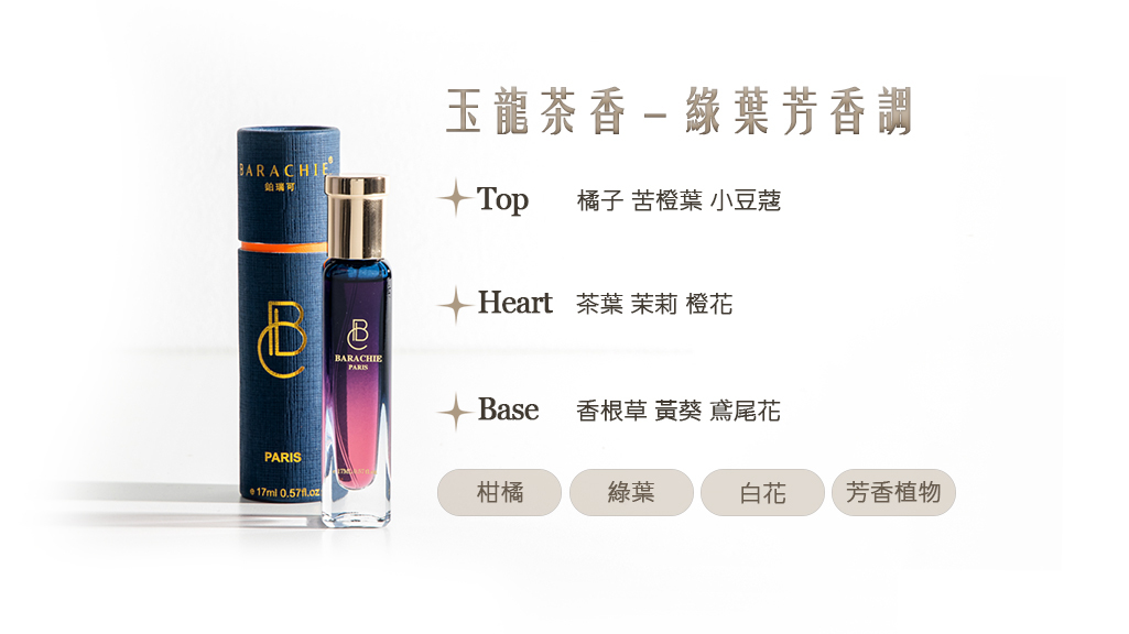 《玉龍茶香》像清晨山谷裡的一縷晨風,清新、透亮,帶著自然的溫度。前調的橘子與苦橙葉清爽明亮,小豆蔻的微辛像輕輕撥動的心弦,喚醒感官,讓人精神為之一振。中調中,茶葉的溫潤氣息與茉莉、橙花的白花香緩緩交織,如晨光灑落在翠綠茶園,柔和而優雅。最後,香根草、黃葵與鳶尾花沉穩收尾,木質與花香相互融合,餘韻悠長,帶著寧靜而舒適的自然氣息。《玉龍茶香》是一種清新而純粹的陪伴,像輕啜一口茶,讓人心安,也讓思緒悠然流淌。