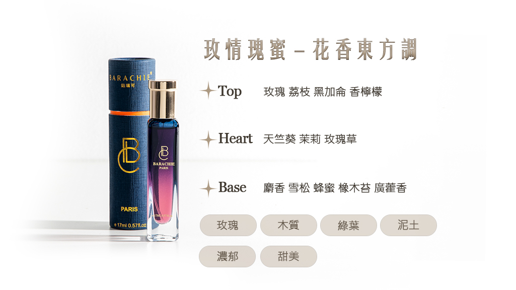 《玫情瑰蜜》像午後陽光灑落在秘密花園裡的甜蜜時光,濃郁而迷人。前調的玫瑰與荔枝、黑加侖、香檸檬交織,果香與花香碰撞出清新而誘人的火花,像初見心動的悸動。中調的天竺葵、茉莉與玫瑰草慢慢綻放,花香溫柔而層次分明,帶著綠葉的自然氣息,如花園深處悄然綻放的秘密。最後,麝香、雪松、蜂蜜、橡木苔與廣藿香沉穩收尾,木質與泥土的溫度包裹著甜美香氣,餘韻悠長而誘人,如溫柔擁抱般纏繞感官。《玫情瑰蜜》是一款甜美濃郁、木質與花香交織的香氛,帶著玫瑰般的熱情與柔情,令人心動不已。