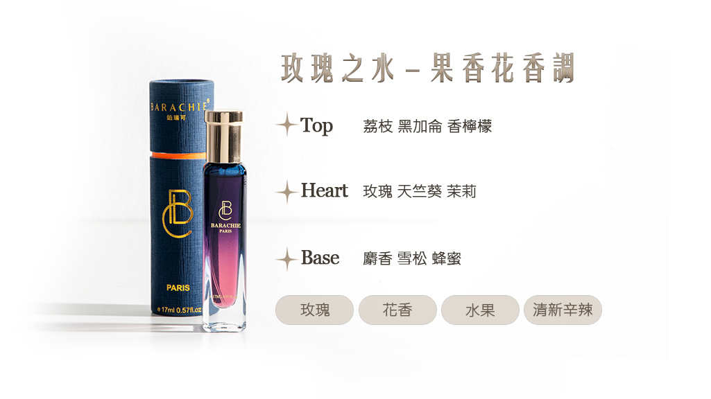 《玫瑰之水》像清晨花園裡的一縷微光,甜美而透亮。前調的荔枝、黑加侖與香檸檬交織出清新果香,如晨露輕落在花瓣上,帶來活力與愉悅。中調的玫瑰、天竺葵與茉莉層層綻放,花香柔美而優雅,像微風輕撫臉龐,細膩而迷人。最後,麝香、雪松與蜂蜜沉穩收尾,木質與甜香融合,餘韻溫暖而持久,如陽光慢慢照亮整片花園。《玫瑰之水》是一款甜美果香與優雅花香交織的香氛,清新、柔和又帶著微微辛香,讓人心情隨之舒展,流連於花園的每一個瞬間。