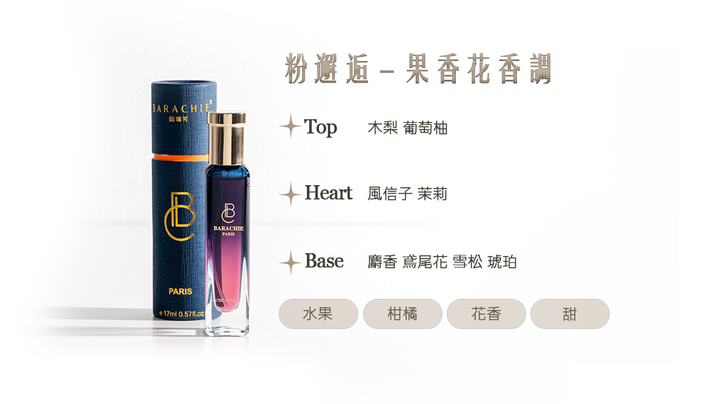 《粉邂逅》是一場不經意卻怦然心動的相遇。前調由木梨的清甜果香輕輕展開,混合葡萄柚明亮的柑橘氣息,像晨光灑落街角的第一眼對視,清新、活潑,又帶著微微的甜意,讓人忍不住多停留一秒。中調裡,風信子與茉莉悄然綻放,花香柔軟而透明,彷彿情感在心底慢慢發酵,既純真又溫柔,像一段尚未說出口的喜歡。隨著時間流轉,麝香、鳶尾花與雪松交織出細膩而溫暖的尾韻,琥珀為整體添上一層柔光,留下貼近肌膚的甜美餘香。《粉邂逅》是一款果香與花香交融的香氛,輕盈卻令人難忘,適合那些相信緣分、也願意為心動停下腳步的人。