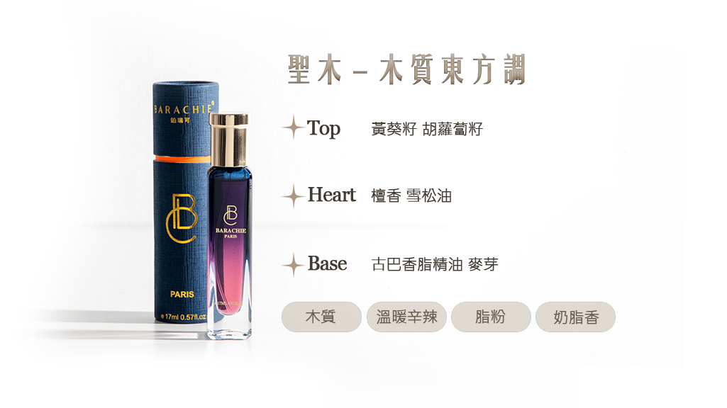 《聖木》像一段靜謐的祈禱,在木質香氣中流淌著溫暖與深沉。阿米香樹花的香氣柔和綻放,如晨光透過古老殿堂的窗棂,帶著輕盈而神聖的氣息。檀香木厚實而穩定,像安靜的木椅支撐著時間的重量,散發沉穩的安全感。苦配巴香脂微微辛香,帶出層次感,並混合脂粉與奶脂般的溫潤,讓整體香氣更貼近肌膚。《聖木》不是喧鬧的存在,而是一種內斂而深情的陪伴,像靜坐於木香環繞的空間,呼吸間感受到溫暖、安定與神秘的平衡。