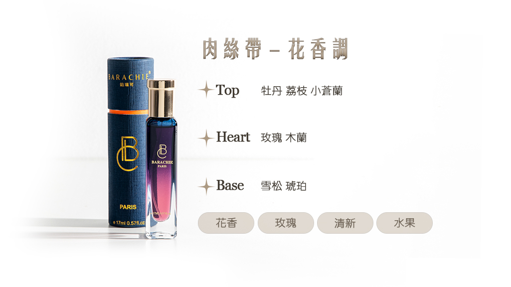 《肉絲帶》像午后花園裡的一縷微風,輕盈而充滿生氣。前調的牡丹、荔枝與小蒼蘭交織出清新果香與柔美花香,像陽光灑落在嫩葉與花瓣上的溫暖感,令人心情愉悅。中調的玫瑰與木蘭悄然綻放,花香柔和而優雅,如微風拂過花叢,帶來恰到好處的浪漫與層次。最後,雪松與琥珀沉穩收尾,木質的溫暖與香氣的持久感如花園裡的安靜角落,悠長而舒心。《肉絲帶》是一款清新、甜美又帶木質溫度的花香香氛,如午後的花園微光,悄悄撫慰每一個瞬間。