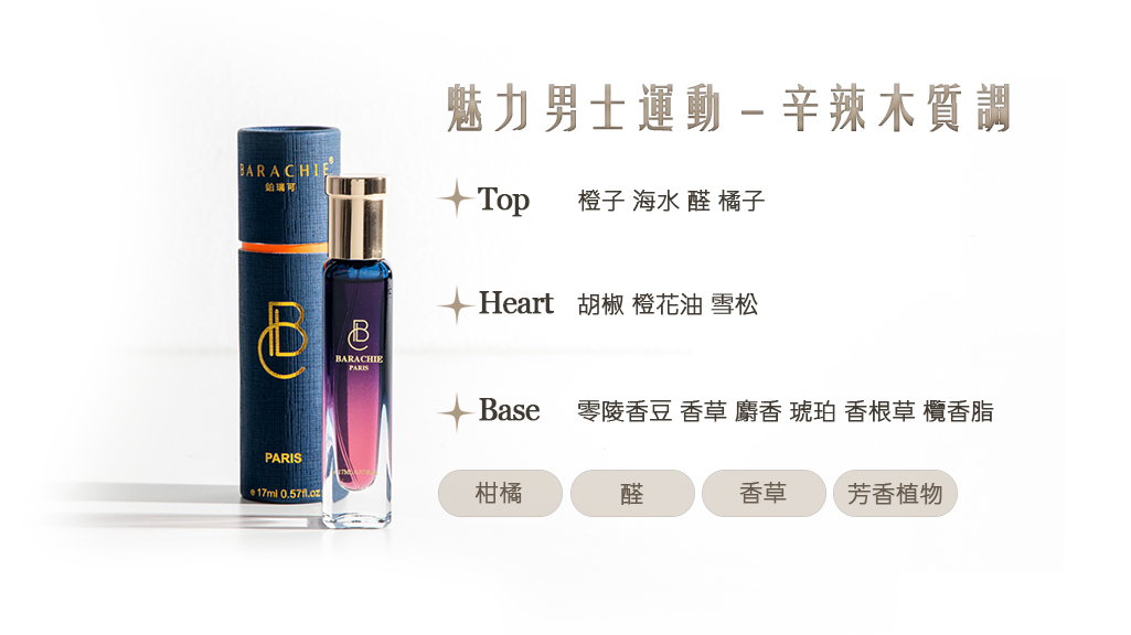 《魅力男士運動》像一場清晨的奔跑,帶著汗水的熱度,也帶著空氣中透亮的自由。前調的橙子與橘子清新醒腦,海水與醛的氣息像迎面而來的涼風,瞬間喚醒感官,充滿活力與動感。中調的胡椒與橙花油交織雪松的木質香氣,像肌肉緊繃卻有節奏的律動,剛勁中透出成熟的魅力。最後,零陵香豆、香草與麝香、琥珀、香根草和欖香脂落下溫暖而深沉的尾韻,柔和而持久,像運動後汗水蒸散的餘溫,留下無聲卻令人難以忽視的吸引力。《魅力男士運動》是清新、辛辣與溫暖的完美平衡,陪伴每一個敢於前行的瞬間。