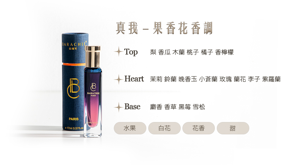 《真我》像晨光灑落的花園,清新又充滿生命力。前調的梨、香瓜、木蘭與桃子交織橘子與香檸檬的明亮果香,像清晨第一口呼吸,清透而活力滿溢。中調的茉莉、鈴蘭、晚香玉、小蒼蘭、玫瑰與蘭花層層綻放,李子與紫羅蘭輕輕點綴,花香柔美而細膩,甜而不膩,像自由自在、真誠展現自我的笑容。尾韻裡,麝香、香草、黑莓與雪松慢慢沉澱,溫暖而貼膚,如輕柔擁抱般留在記憶深處。《真我》是一款果香與白花交織的香氛,甜美而優雅,清新中帶著內在的深度,彷彿訴說著最純粹的自己。